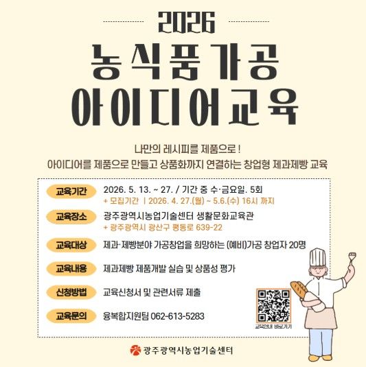 (포탈뉴스통신) 광주광역시 농업기술센터는 제과·제빵 창업을 희망하는 예비창업자를 대상으로 ‘농식품 가공 아이디어 교육’을 5월 13일부터 27일까지 총 5회 과정으로 운영한다.