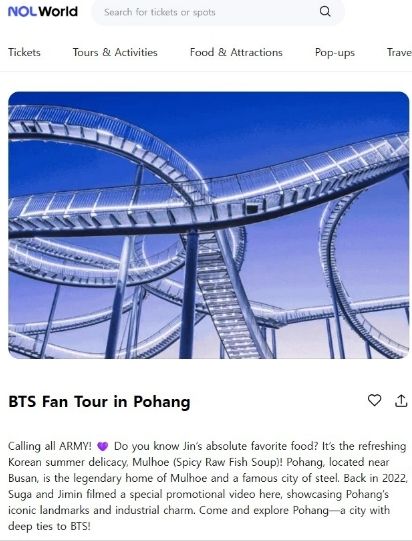 시는 27일부터 외국인 전용 글로벌 플랫폼 ‘NOL World’와 협업해 BTS 공연을 계기로 방한하는 해외 관광객을 대상으로 포항 관광 홍보를 추진한다.