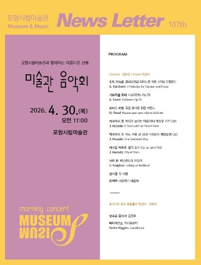 (포탈뉴스통신) 포항시립미술관은 오는 30일 오전 11시 미술관 로비에서 제107회 미술관 음악회 ‘MUSEUM·MUSIC’을 개최한다.