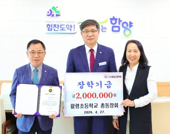 (포탈뉴스통신) (재)함양군장학회는 4월 27일 팔령초등학교 총동창회(회장 박갑열)가 지역 인재 육성을 위한 장학금 200만 원을 기탁했다고 밝혔다.