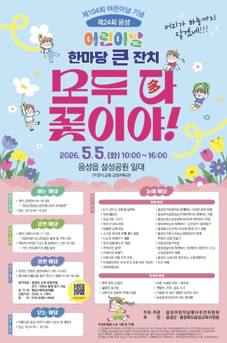 이번 행사는 음성어린이날행사추진위원회가 주최·주관하며, ‘모두 다(多) 꽃이야!’를 주제로 어린이들이 마음껏 꿈을 펼치고 가족과 함께 즐거운 추억을 만들 수 있도록 다채로운 프로그램으로 운영될 예정이다.