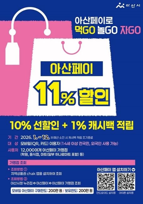 앞으로 시는 아산페이 11% 혜택을 지속 운영하는 한편, 소상공인 지원사업과 연계한 홍보를 강화할 예정이다. 또한 시와 유관기관이 주관하는 행사·축제, 동행축제 연계 홍보관 운영 등을 통해 아산페이 사용처 안내, 가맹점 홍보, 현장 소비 유도 등을 확대해 나갈 방침이다.