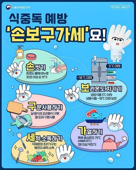 또한 육류는 75도, 어패류는 85도 이상에서 1분 이상 충분히 익혀 먹고 식재료와 조리기구는 깨끗이 세척·소독해야 하고 칼과 도마는 채소·육류·어류용으로 구분해 사용하는 것이 중요하다.