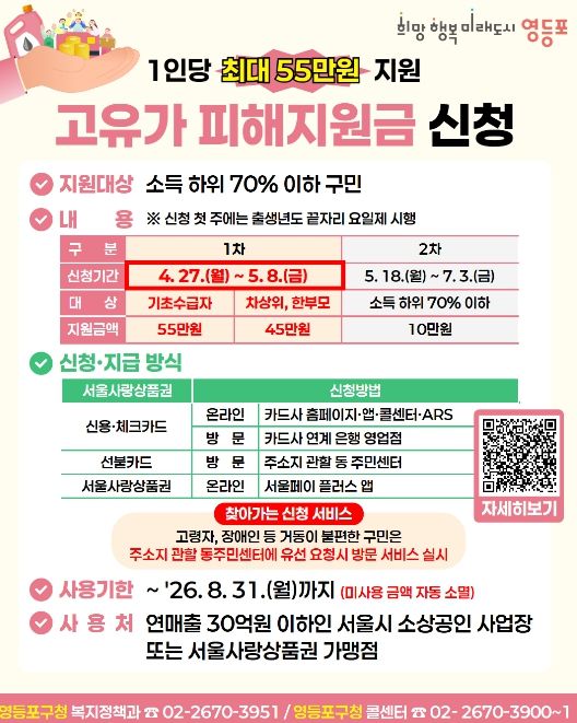 영등포구 복지정책과장은 “고유가로 어려움을 겪는 구민들의 생활 안정에 실질적인 도움이 되길 바란다”라며 “신청 기간을 확인해 대상자 누락 없이 혜택을 받으시길 바란다”라고 전했다.