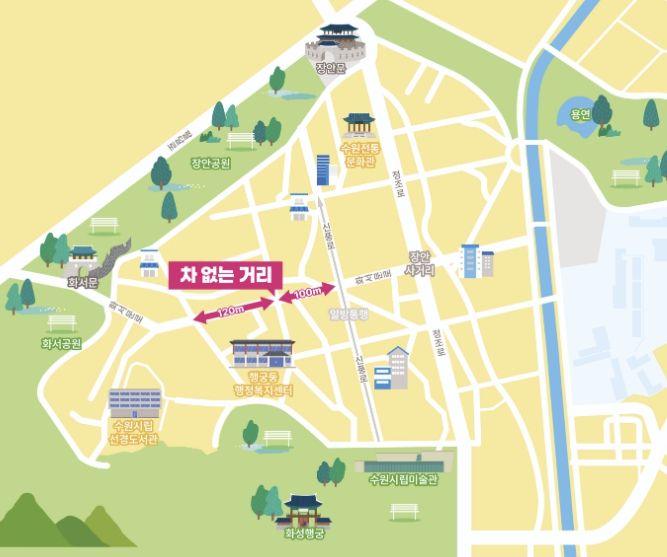 수원시 관계자는 “차 없는 거리 운영은 주민과 상인의 지속적인 노력과 협의의 결과”라며 “행궁동의 골목 정취를 안전하게 즐길 수 있는 보행 문화가 정착되도록 노력하겠다”고 말했다.