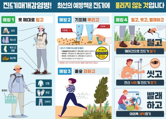 또한 SFTS 예방을 위해서는 △작업복(긴팔·긴바지, 모자, 토시, 장갑, 양말, 목수건, 장화) 착용 △풀밭 위에 앉거나 옷 벗어 놓지 않기 △기피제 뿌리기 △귀가 후 즉시 샤워하기 △작업 또는 귀가 후 일반 옷과 분리 세탁하기를 준수하는 것이 중요하다.
