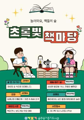 (포탈뉴스통신) 울주군 옹기종기도서관이 다음달 2일부터 오는 6월 30일까지 상설형 야외도서관 ‘초록빛 책마당’을 운영한다고 28일 밝혔다.