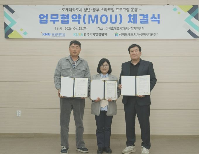 (포탈뉴스통신) 삼척도계도시재생현장지원센터는 4월 23일 센터에서 강원대학교 도계운영본부, 사단법인 한국대학발명협회와 함께 ‘도계대학도시 청년·광부 스타트업 프로그램 운영’을 위한 업무협약(MOU)을 체결했다.
