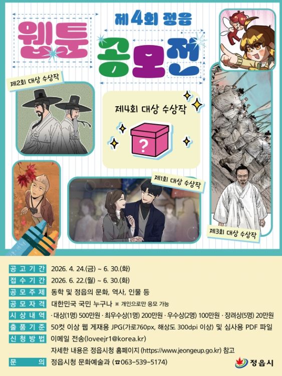시 관계자는 “지난 공모전들을 통해 정읍의 역사와 문화가 웹툰으로 조명되는 성과를 거뒀다”며 “올해도 역량 있는 창작자들이 정읍의 이야기를 바탕으로 개성 있는 작품을 보여주길 기대한다”고 말했다.