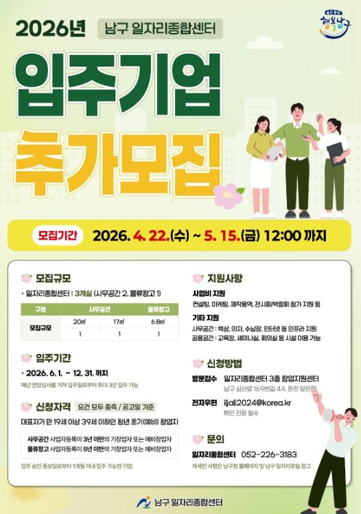 (포탈뉴스통신) 울산 남구는 청년들에게 창업공간을 지원해 안정적으로 사업을 수행할 수 있도록 남구 일자리 종합센터 사무공간 및 물류창고에 입주할 기업을 추가 모집하고 있다고 28일 밝혔다.