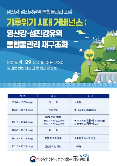 (포탈뉴스통신) 영산강ㆍ섬진강유역물관리위원회는 유역 주요 물관리 현안에 대한 이해관계자 및 전문가의 다양한 의견수렴과 논의를 위하여 '기후위기 시대 거버넌스 : 영산강ㆍ섬진강유역 통합물관리 재구조화'포럼을 4월 29일(수) 김대중컨벤션센터에서 개최한다고 밝혔다.