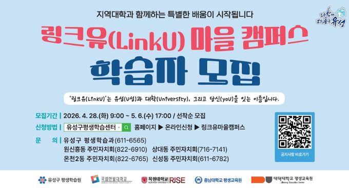 (포탈뉴스통신) 대전 유성구는 5월부터 지역대학과 연계한 주민 밀착형 평생학습 ‘링크유(LinkU) 마을캠퍼스’ 상반기 프로그램을 운영한다.