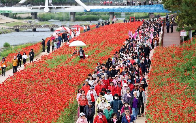 축제의 백미는 동진천변에 펼쳐진 거대한 붉은 봄꽃 군락이다. 왕복 3.3킬로미터(km) 구간을 따라 양귀비 10만 본, 작약 16만 본, 꽃잔디 8만 본을 가득 심고 끝없는 붉은 꽃물결을 빚어냈다.