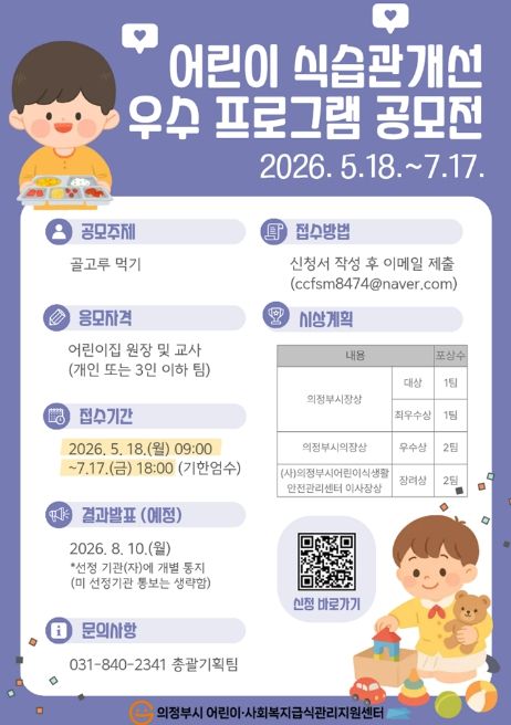 (포탈뉴스통신) 의정부시가 운영하는 의정부시 어린이‧사회복지급식관리지원센터는 어린이 보육시설을 대상으로 5월 18일부터 7월 17일까지 ‘어린이 식습관 개선 우수 프로그램 공모전’을 개최한다.