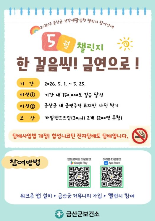 (포탈뉴스통신) 금산군보건소는 지역주민의 건강증진과 금연 실천 분위기 확산을 위해 오는 2026 건강생활실천 5월 챌린지 ‘한 걸음씩! 금연으로!’를 5월 1일부터 25일까지 진행한다.