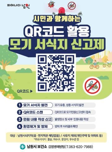 (포탈뉴스통신) 남원시보건소가 여름철 모기 매개 감염병 예방과 시민 편의를 위해 스마트폰 GPS 위치 정보를 활용한 'QR코드 모기 서식지 신고제'를 운영한다고 밝혔다.