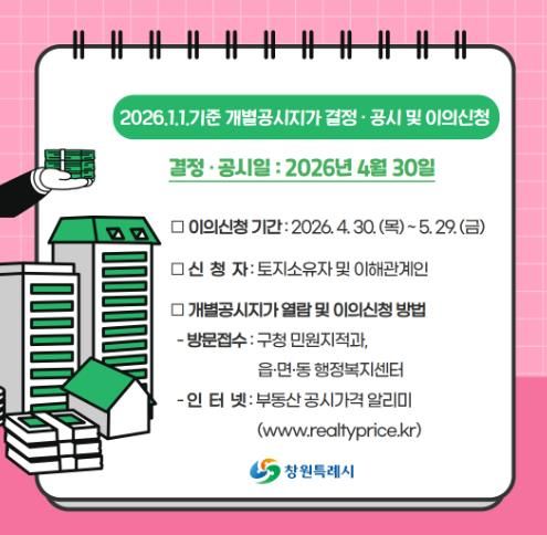 (포탈뉴스통신) 창원특례시는 2026년 1월 1일 기준 개별공시지가 36만 5933필지를 4월 30일 결정·공시하고, 오는 5월 29일까지 이의신청을 접수한다고 밝혔다.
