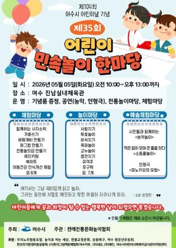 (포탈뉴스통신) 여수시는 제104회 어린이날을 맞아 5월 5일, 아이들이 가족과 함께 전통문화를 즐기며 마음껏 뛰놀 수 있는 민속놀이 놀이 한마당을 개최한다.