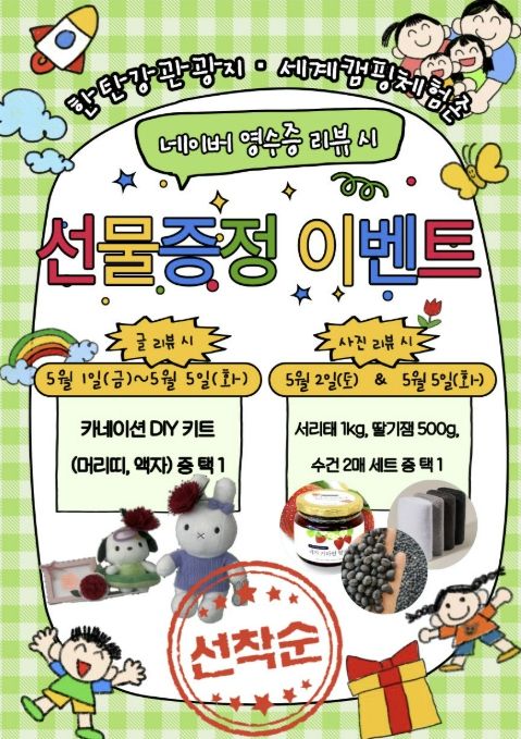 이번 행사의 대표 프로그램은 네이버 영수증 리뷰 이벤트로, 입실 고객이 네이버에 글 리뷰를 작성하면 가정의 달을 기념하는 카네이션 DIY 키트를 선착순으로 제공한다. 사진 또는 동영상이 포함된 리뷰를 작성한 고객에게는 한탄강관광지 지역상생 홍보관 입점 농산품을 선착순으로 제공한다.