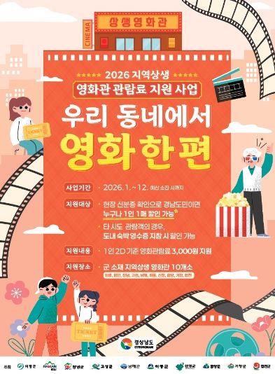 (포탈뉴스통신) 거창군은 다가오는 5월 가정의 달을 맞이해 군민들의 문화 향유 기회를 확대하고 지역 영화관의 활성화를 돕기 위해 ‘2026년 지역상생 영화관 관람료 지원사업’을 시행한다.