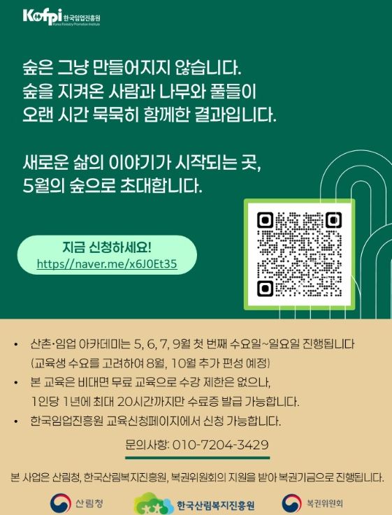 교육 신청은 한국임업진흥원 교육신청 페이지 또는 네이버폼(QR코드)을 통해 가능하다.