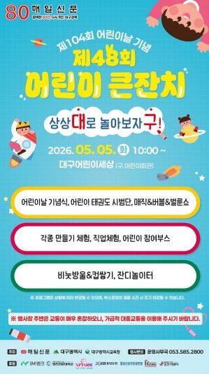 (포탈뉴스통신) 대구광역시는 제104회 어린이날을 맞아 어린이와 온 가족이 함께 즐길 수 있는 풍성한 문화·체험 행사를 시 전역에서 개최한다.