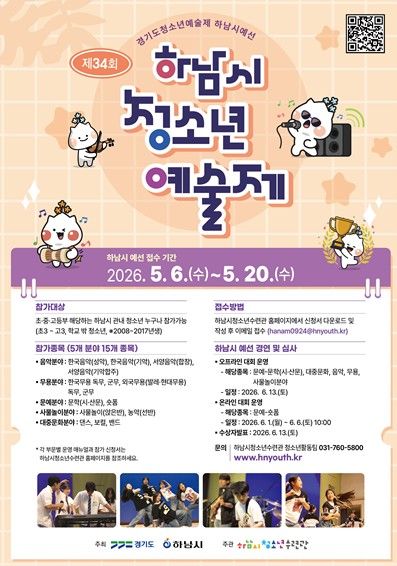 (포탈뉴스통신) 하남시가 주최하고 하남시청소년수련관이 주관하는 ‘2026 제34회 하남시청소년예술제’가 오는 6월 13일 하남시청소년수련관에서 개최된다.