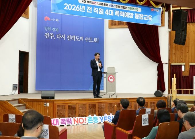 (포탈뉴스통신) 전주시는 28일 시청 강당에서 우범기 전주시장을 비롯한 5급 이상 간부 공무원 100여 명을 대상으로 ‘2026년 직장 내 4대 폭력 예방 통합교육’을 실시했다.