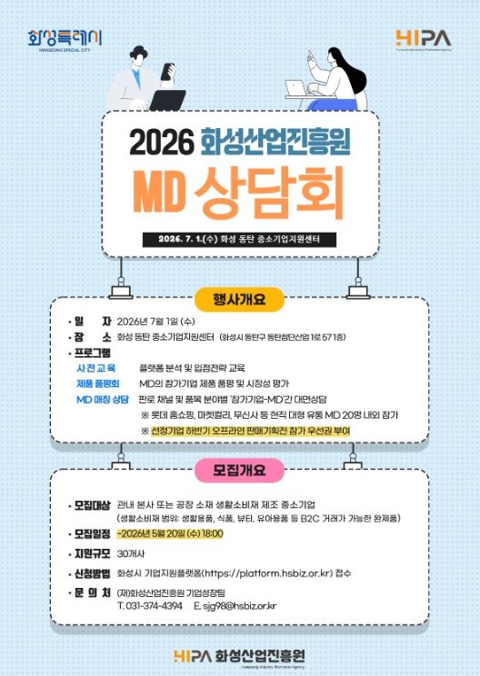 (포탈뉴스통신) 화성산업진흥원(원장 전병선)은 화성시 생활소비재 기업의 대형 유통망 진입과 신규 판매채널 확보를 지원하기 위해 ‘2026년 화성산업진흥원 MD 상담회’를 개최하고, 오는 5월 20일까지 참여기업을 모집한다.