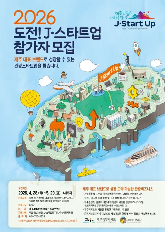 (포탈뉴스통신) 제주특별자치도와 제주관광공사(사장 고승철)는 오는 5월 29일까지 온라인 채널을 통해 제주 관광산업 혁신을 선도할 유망 기업을 발굴하고 육성하기 위해 ‘2026 도전! J-스타트업’ 참가기업을 모집하고 있다고 28일 밝혔다.