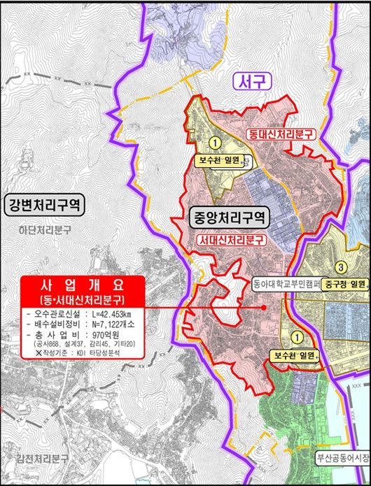 동대신·서대신 처리분구 지역은 남포동, 자갈치시장 등 주요 관광자원과 부산대학교병원, 동아대학교병원 등 대형 의료시설이 위치해 관광객과 방문객 유입이 많은 지역이나, 분류식 하수관로 설치율이 낮아 정비 필요성이 큰 곳이다.
