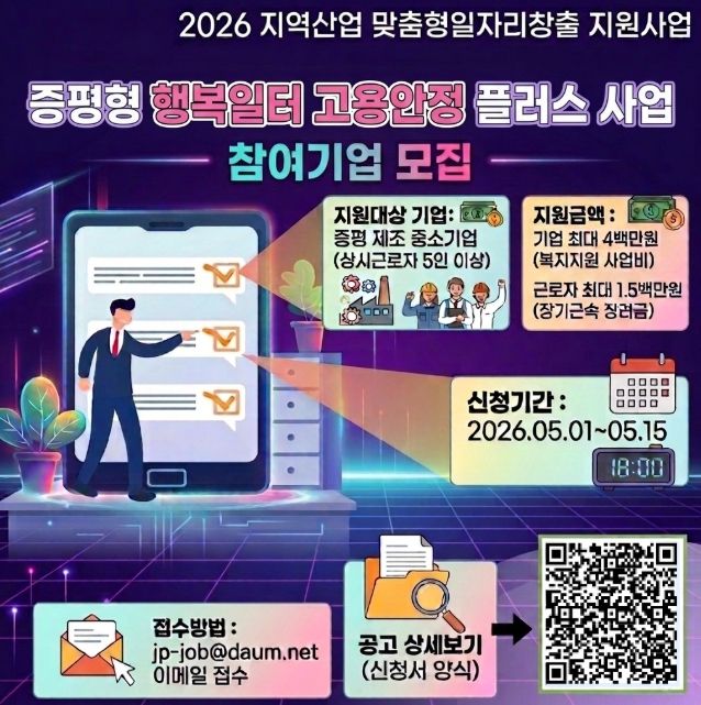 (포탈뉴스통신) 충북 증평군이 지역 제조 중소기업의 고용안정과 장기근속 문화 확산을 위해 ‘2026 증평형 행복일터 고용안정 플러스 사업’ 참여기업을 모집한다.