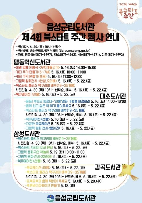 (포탈뉴스통신) 음성군립도서관(맹동혁신·대소·삼성·감곡)은 5월 16일부터 22일까지 ‘북스타트 주간’을 맞이해 영유아와 보호자가 함께 참여할 수 있는 다양한 프로그램을 운영한다.