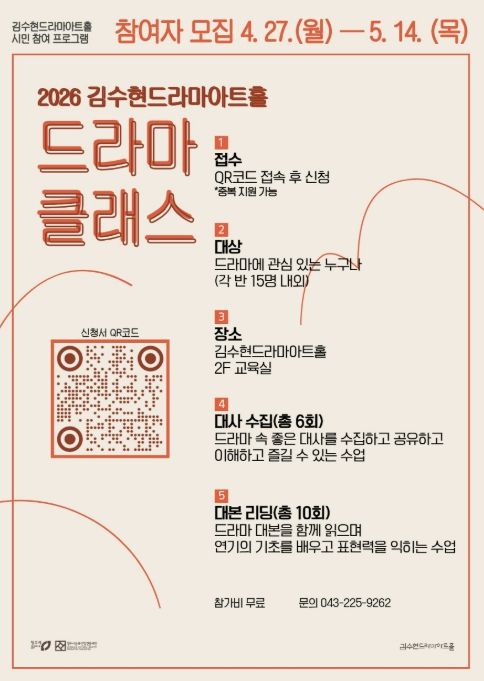 청주시문화산업진흥재단이 운영하는 국내 유일의 드라마문학관 김수현드라마아트홀은 5월 14일까지 ‘드라마 클래스’참여자를 모집한다고 29일 밝혔다.