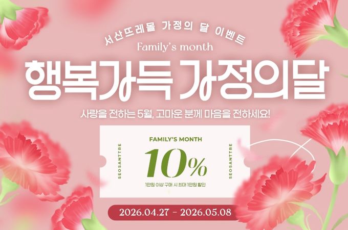 서산뜨레몰에서는 5월 8일까지 전 품목 구매 시 사용할 수 있는 10% 할인쿠폰(최대 1만 원 할인)을 제공한다.