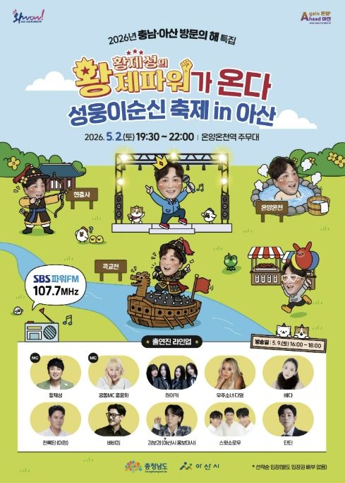 (포탈뉴스통신) 인기 라디오 프로그램 SBS 파워FM ‘황제성의 황제파워’ 공개방송이 5월 2일 ‘제65회 아산 성웅 이순신축제’ 현장에서 열린다. 아산에서 라디오 공개방송이 열리는 것은 2013년 ‘대한민국 아산 온천대축제’ 이후 13년 만이다.