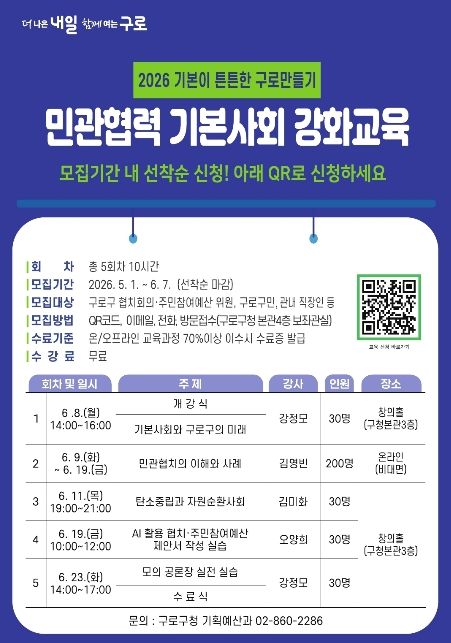 (포탈뉴스통신) 구로구가 오는 6월 민관협치 활성화와 주민참여 확대를 위해 ‘민관협력 기본사회 강화교육’을 운영하고 5월 1일부터 교육생을 선착순으로 모집한다.