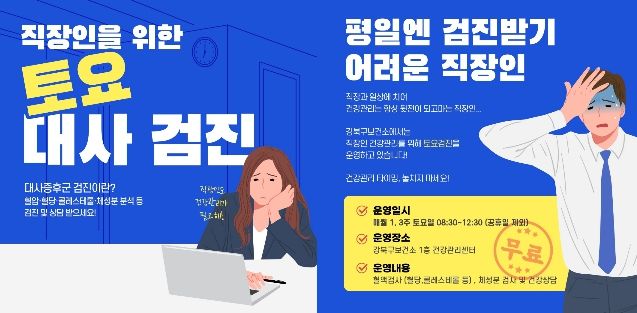 (포탈뉴스통신) 서울 강북구 보건소 건강관리센터가 평일에 시간을 내기 어려운 직장인들의 건강 회복을 위해 ‘직장인 맞춤형 토요 대사증후군 검진 서비스’를 운영하며 구민 건강권 확보에 나섰다.