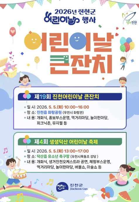 (포탈뉴스통신) 충북 진천군은 제104회 어린이날을 맞아 5월 5일 진천읍 화랑공원과 덕산읍 유소년축구장 두 곳에서 어린이날 기념행사를 개최한다고 밝혔다.