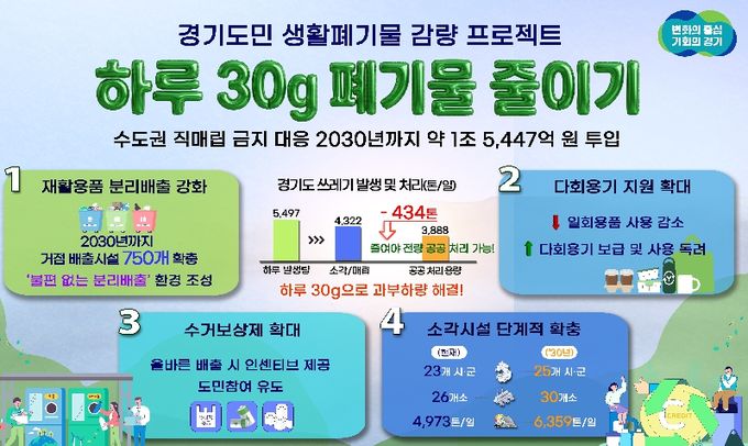 (포탈뉴스통신) 수도권 직매립 금지에 따른 생활쓰레기 감량을 위해 경기도가 2030년까지 5년간 약 1조 5,447억 원을 투입하는 ‘하루 30g, 도민실천형 생활폐기물 감량 프로젝트’를 추진한다.