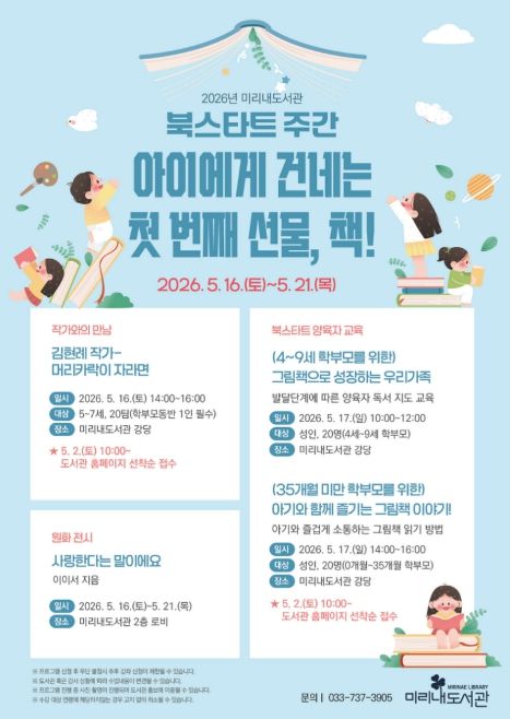 (포탈뉴스통신) 원주시 미리내도서관은 다음 달 16일부터 21일까지 북스타트코리아와 함께 ‘아이에게 건네는 첫 번째 선물, 책!’을 주제로 북스타트 주간 프로그램을 운영한다.