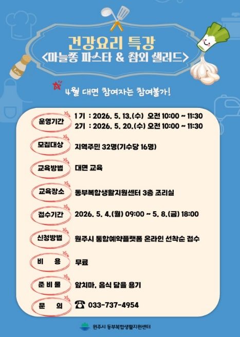 (포탈뉴스통신) 원주시 동부복합생활지원센터는 다음 달 4일부터 ‘마늘쫑 파스타·참외 샐러드 만들기’ 건강 요리 특강 프로그램 참여자를 모집한다.