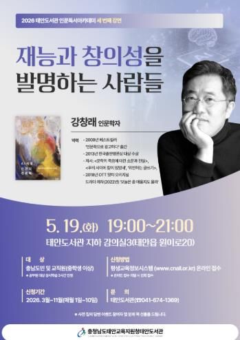 (포탈뉴스통신) 충청남도태안교육지원청태안도서관은 오는 5월 19일 오후 7시 도서관 지하 강의실에서 ‘재능과 창의성을 발명하는 사람들’을 주제로 인문독서 아카데미를 운영할 예정이다.