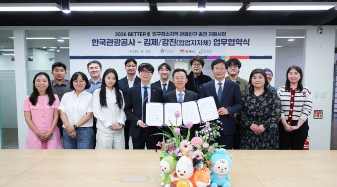 시는 지난 28일 한국관광공사 서울센터에서 '2026 BETTER里: 인구감소지역 관광인구 충전사업' 업무협약(MOU)을 체결했다. 이날 협약식에는 이현서 부시장과 한국관광공사 관광산업본부장을 비롯해 이번 실증사업을 이끌어갈 7개 관광 벤처기업 대표 등 30여 명이 참석했다. 이번 협약은 김제시의 관광 생활인구 증대 및 지역경제 활성화를 위한 확고한 민관 협력체계를 구축하기 위해 마련됐다.