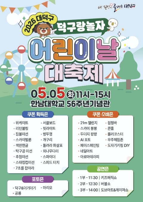 (포탈뉴스통신) 대전 대덕구는 제104회 어린이날을 맞아 아동과 가족이 함께 즐길 수 있는 ‘덕구랑 놀자! 대덕구 어린이날 대축제’를 개최한다고 밝혔다.