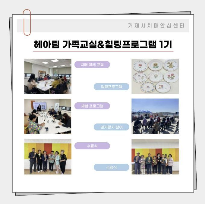 (포탈뉴스통신) 거제시치매안심센터는 치매 대상자 가족 지원을 위해 3월부터 4월까지 8주간 ‘헤아림 가족교실’과 ‘힐링프로그램’ 1기를 성공적으로 운영하고 지난주 수료식을 개최했다.