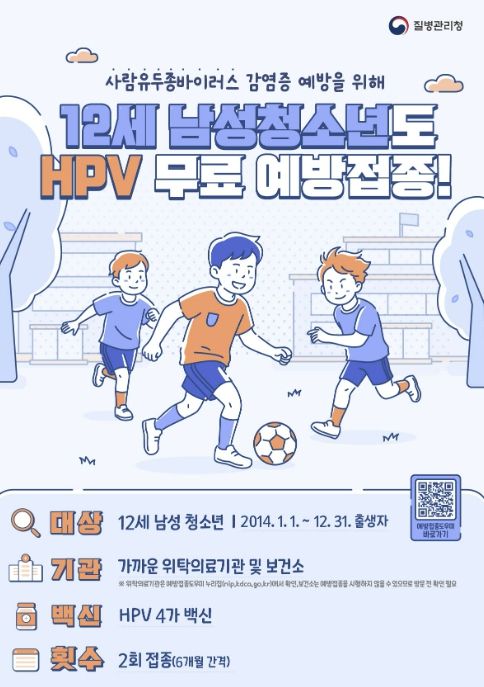 현재 HPV 국가예방접종 지원 대상은 12~17세 여성청소년(2008~2014년생)과 18~26세 저소득층 여성(1999~2007년생)이며, 이번 확대에 따라 2014년생 남아도 HPV 예방접종을 무료로 받을 수 있다.