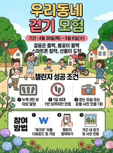 오는 4월 30일부터 5월 6일까지 운영될 이번 프로그램은 아이들이 실내에서 스마트폰 등 디지털 기기에 의존하는 시간을 줄이고, 봄꽃이 피는 야외로 나가 일상 속 신체 활동을 즐길 수 있도록 하는 데 목적을 뒀다.