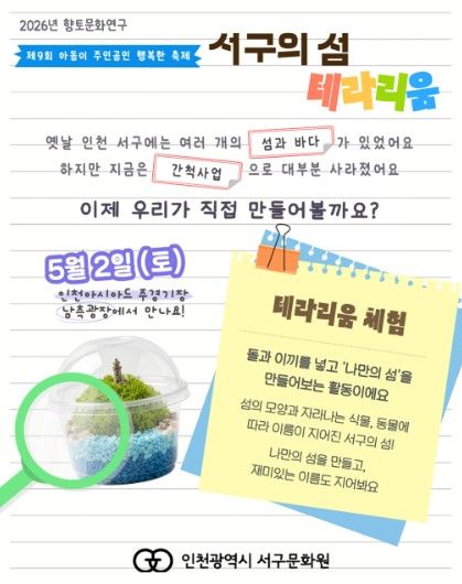 (포탈뉴스통신) 인천광역시 서구문화원은 오는 5월 2일 인천아시아드주경기장 남측광장에서 열리는 제9회 아동이 주인공인 행복한 축제’에서 ‘서구의 섬, 테라리움 만들기’ 체험 부스를 운영한다고 밝혔다.