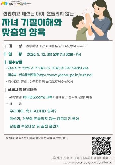 (포탈뉴스통신) 연수구 송도건강생활지원센터는 5월 가정의 달을 맞아 5월 12일, 관내 초등학생 이하 자녀를 둔 부모를 대상으로 ‘자녀 기질의 이해와 맞춤형 양육’ 비대면 교육을 운영한다.